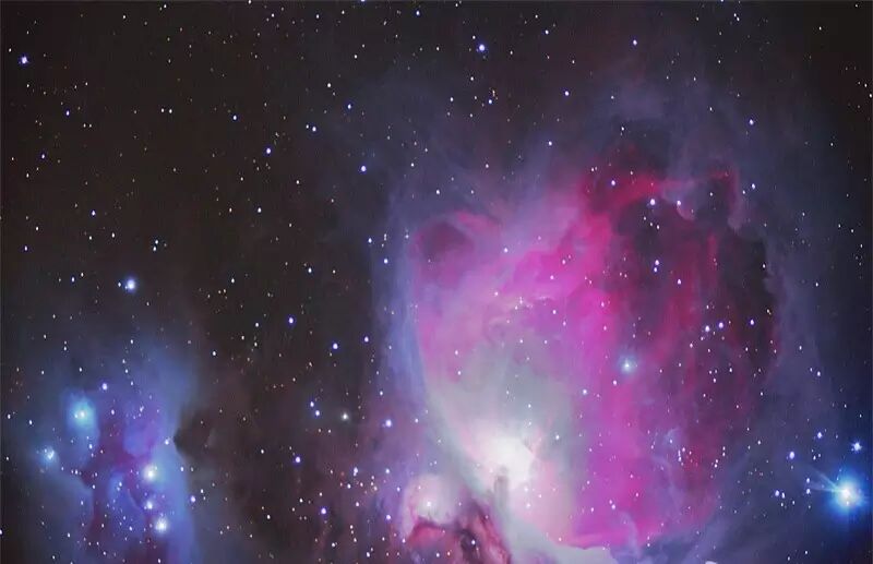 这是在天文台我拍摄的一张照片,对准的是猎户座的大星云,这个大星云里边有很多故事,比如说这些非常浓密的地方,就是一些大颗粒的尘埃或者气体形成的,一些又冷又暗,这种雾霾到处有,哪也跑不掉。