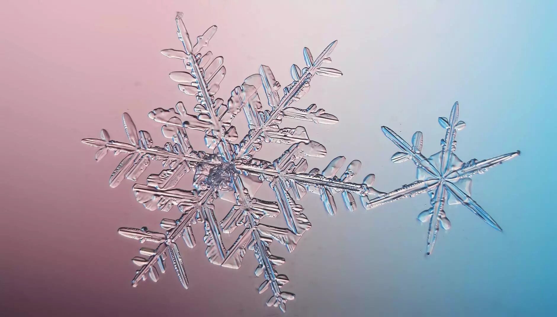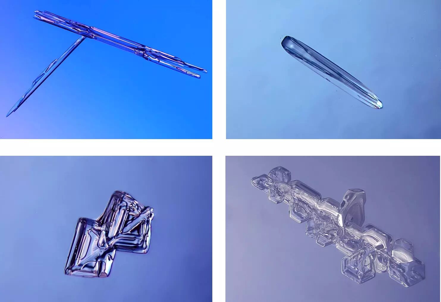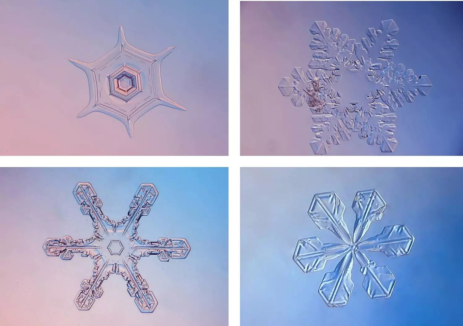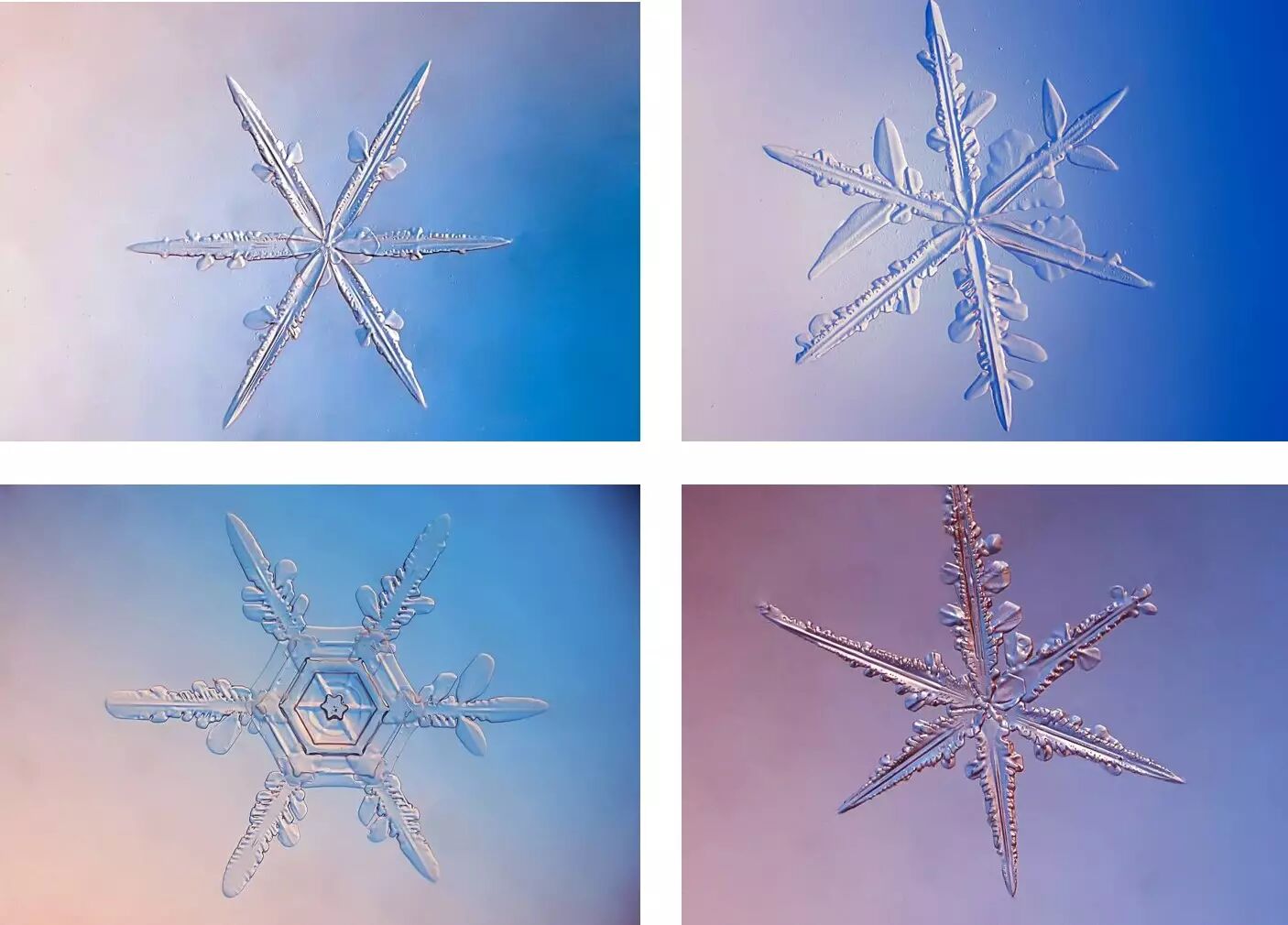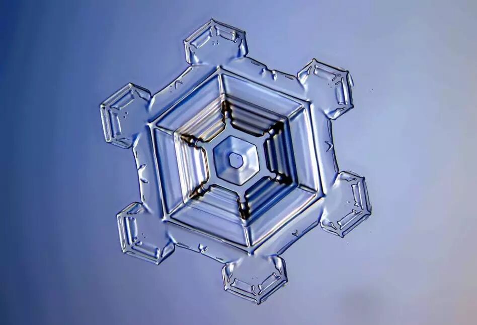 雪花最美的时候是在零下十五度左右,所以可以看到,非常大而复杂的雪花,这些雪花在云中慢慢地生长,上下翻飞,在不同的环境下生长,才形成了这些复杂又美丽的图案。