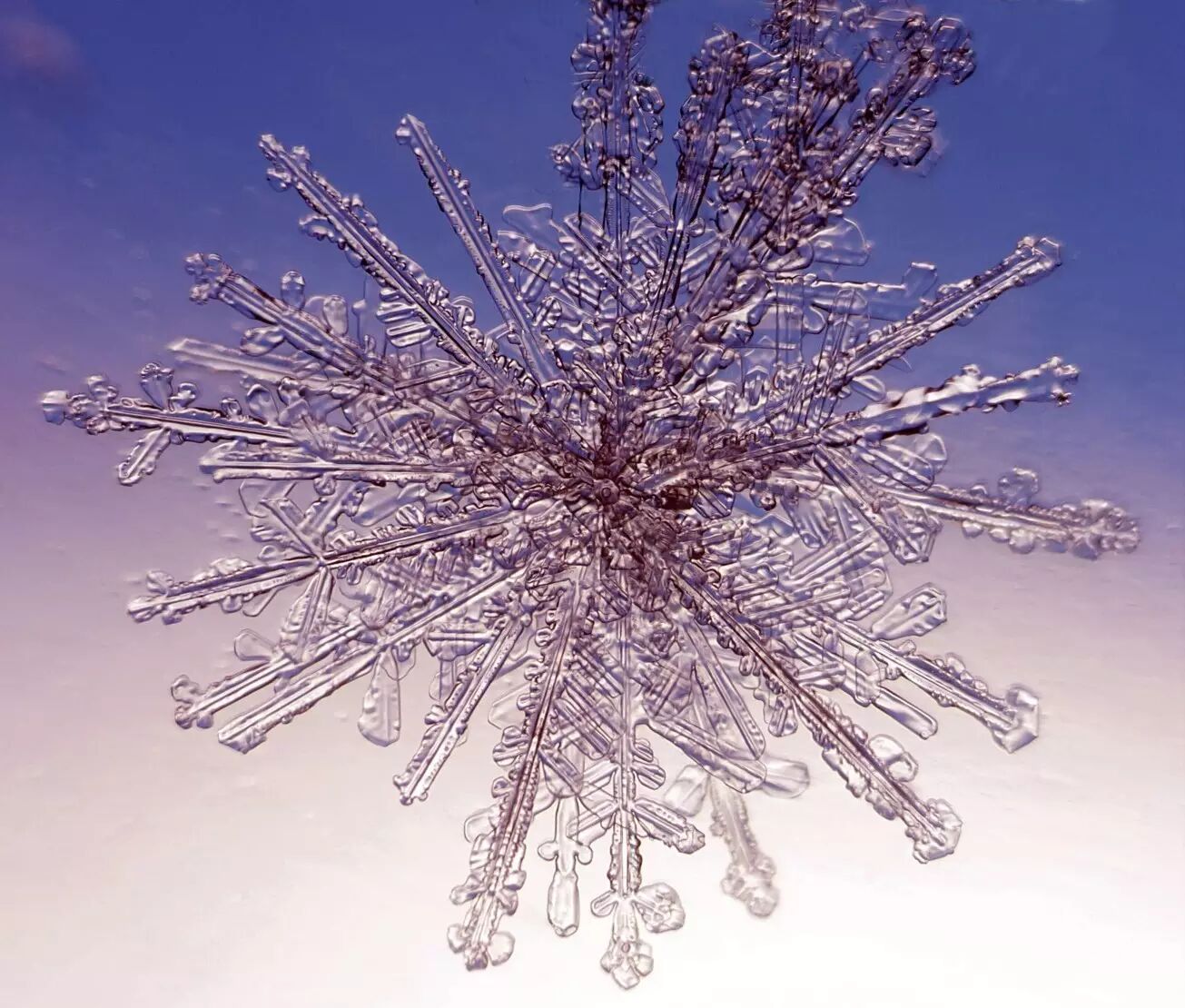 可能就是因为这些雪花长得太细了,都是细脚伶仃的样子,它们之间就很容易连起来,落下来就结成这么大一片儿,成了“鹅毛”大雪。