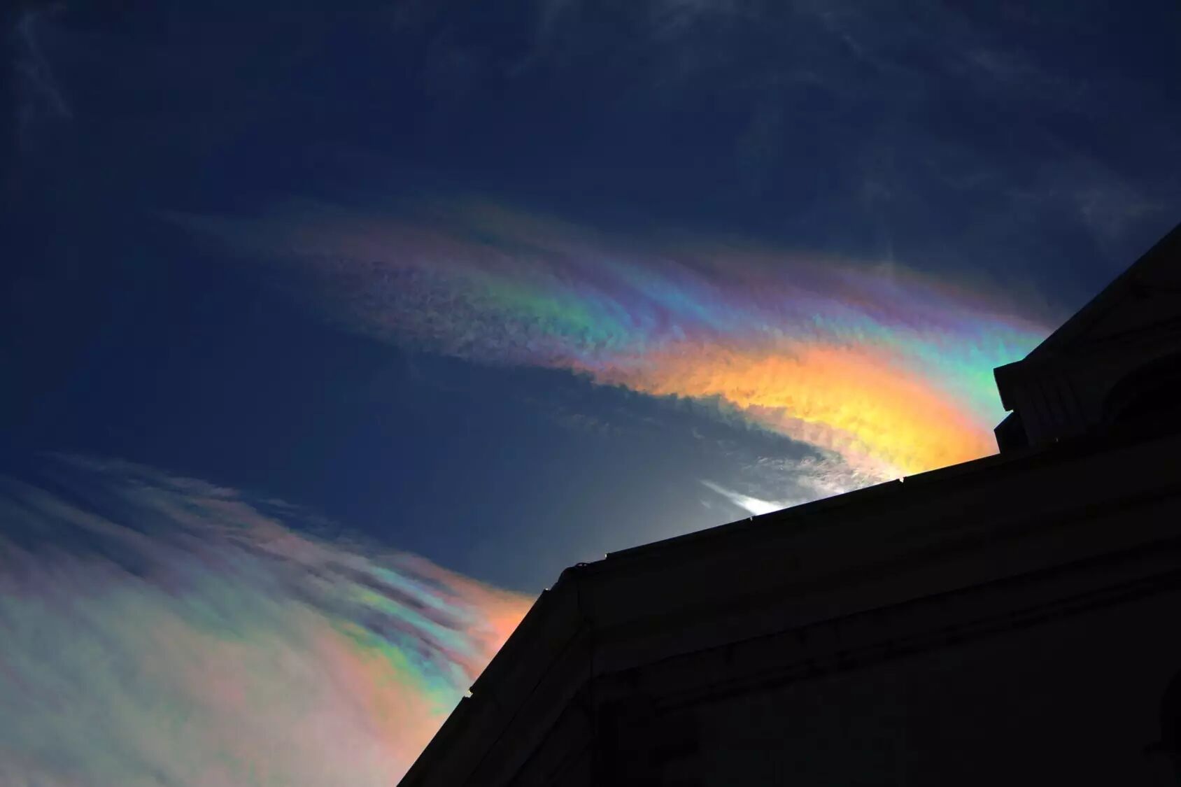 比如说有的时候,云彩呈彩色状,这个叫虹彩云。