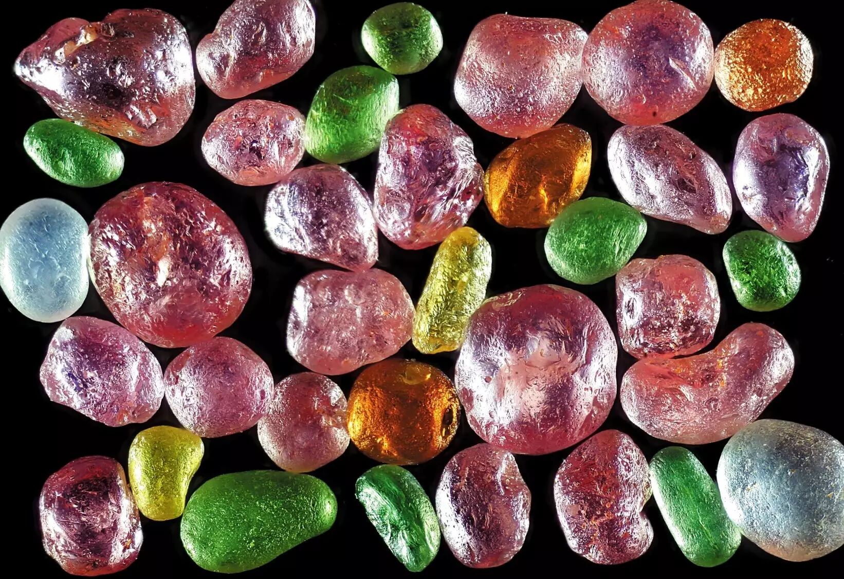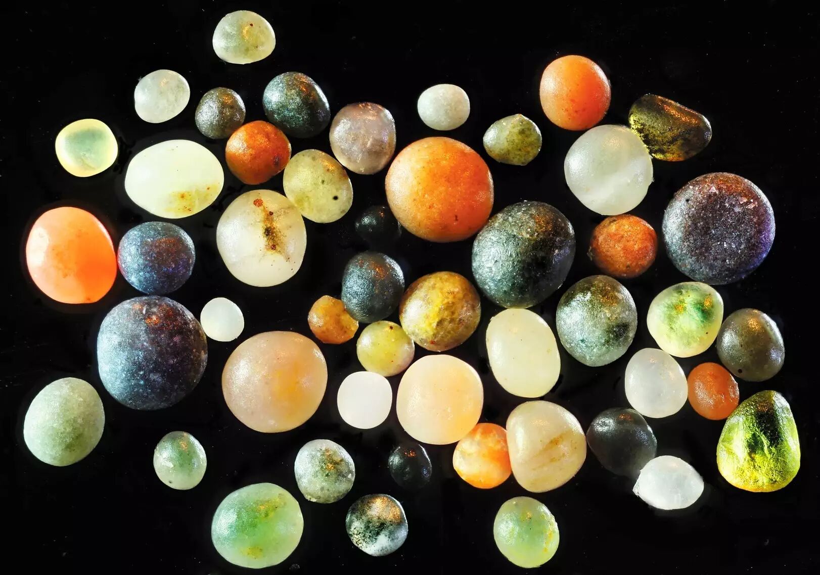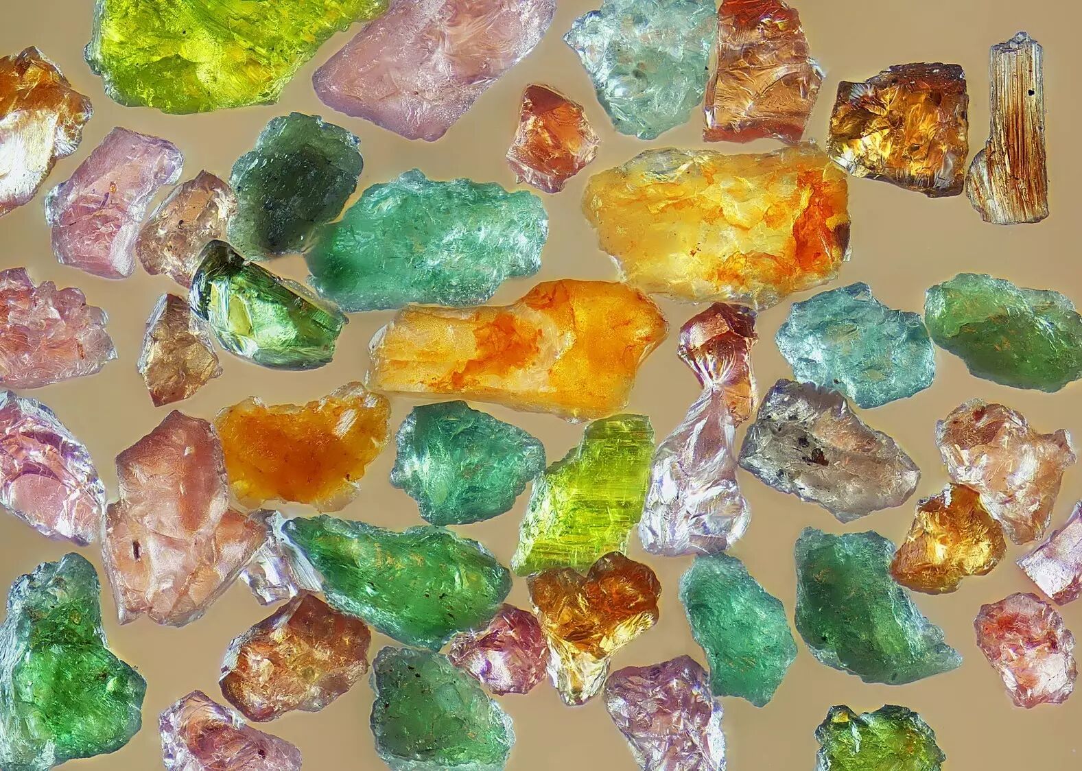 这是法属的一个火山岛产的沙子。宏观看是一种褐色的感觉,但放大,它变得非常非常的浪漫,橘色的,玫瑰色的,一粒沙子就是一颗宝石,因为这个地方的沙子就是宝石做的,橄榄石啊,石榴石。反正火山能够形成的矿物,都会形成非常漂亮的沙子。