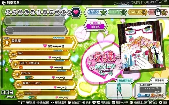 就丰富程度来说,《未来之声DX》本体就高达238首的海量乐库,绝对能够让你在音乐的海洋当中徜徉上相当长一段时间,并且本身每首歌曲搭配的华丽PV更加长了重复收听价值;就游戏性来说,EX难度搭配上三种不同的节奏选项,单单只是将全部歌曲通关一次,没个一年半载是压根不可能完成的,对于“手残”一点的玩家来说更可谓是一辈子都不可能完成的任务。