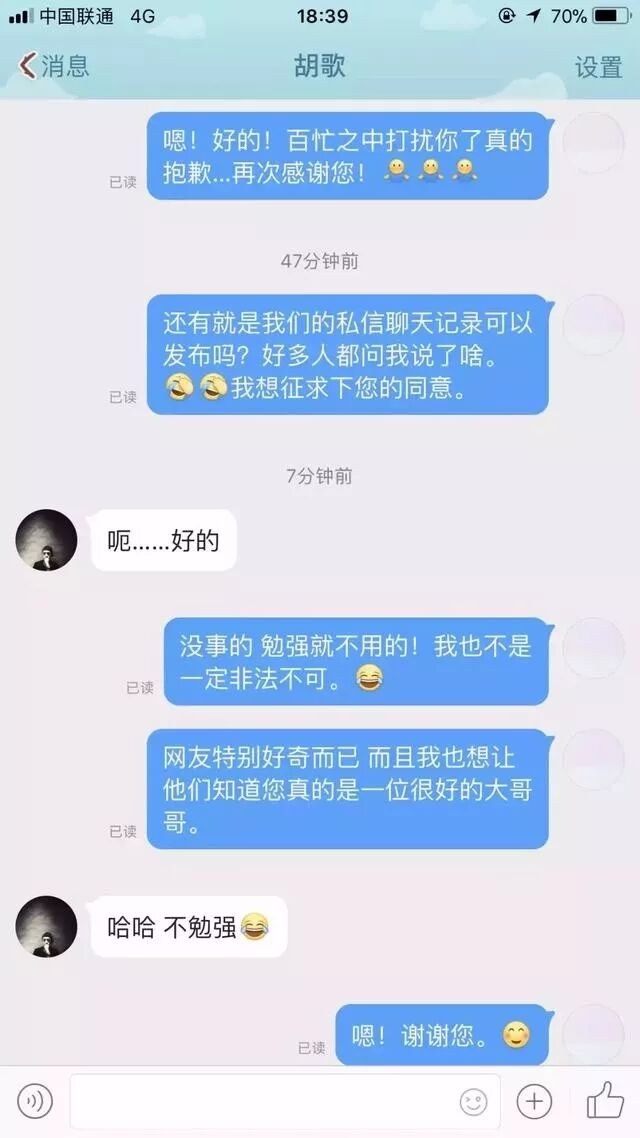为了表达对网友支持的感谢,也为了让大家看到自己的偶像不负众望,姑娘想把聊天内容发出去,她小心翼翼地征求了偶像的意见。