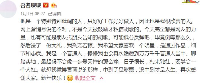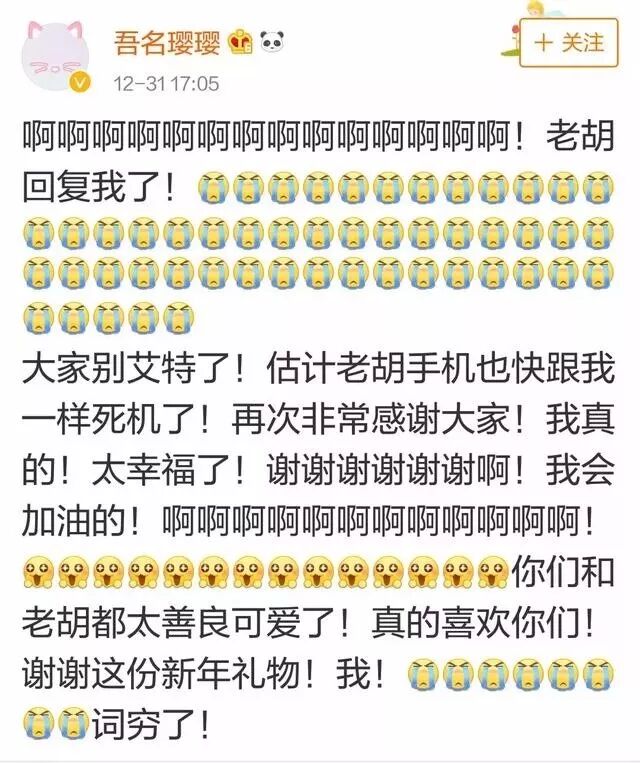 而她也在2017年的最后一天许下一个愿望,希望自己的偶像胡歌可以给自己说一句或一段话。为此,她还特别强调,只是简单@一下胡歌,在能做梦的时候多做的一个梦而已,别无他意。