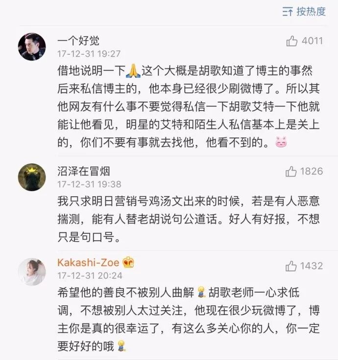 也有人说,不要去打扰胡歌,希望不要有过多的揣测和琢磨,让2017年最后一个小美好结束至此。