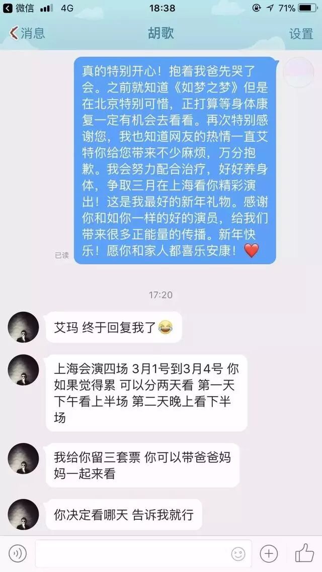 胡歌不仅关注了她的微博,而且还私信回复了她。