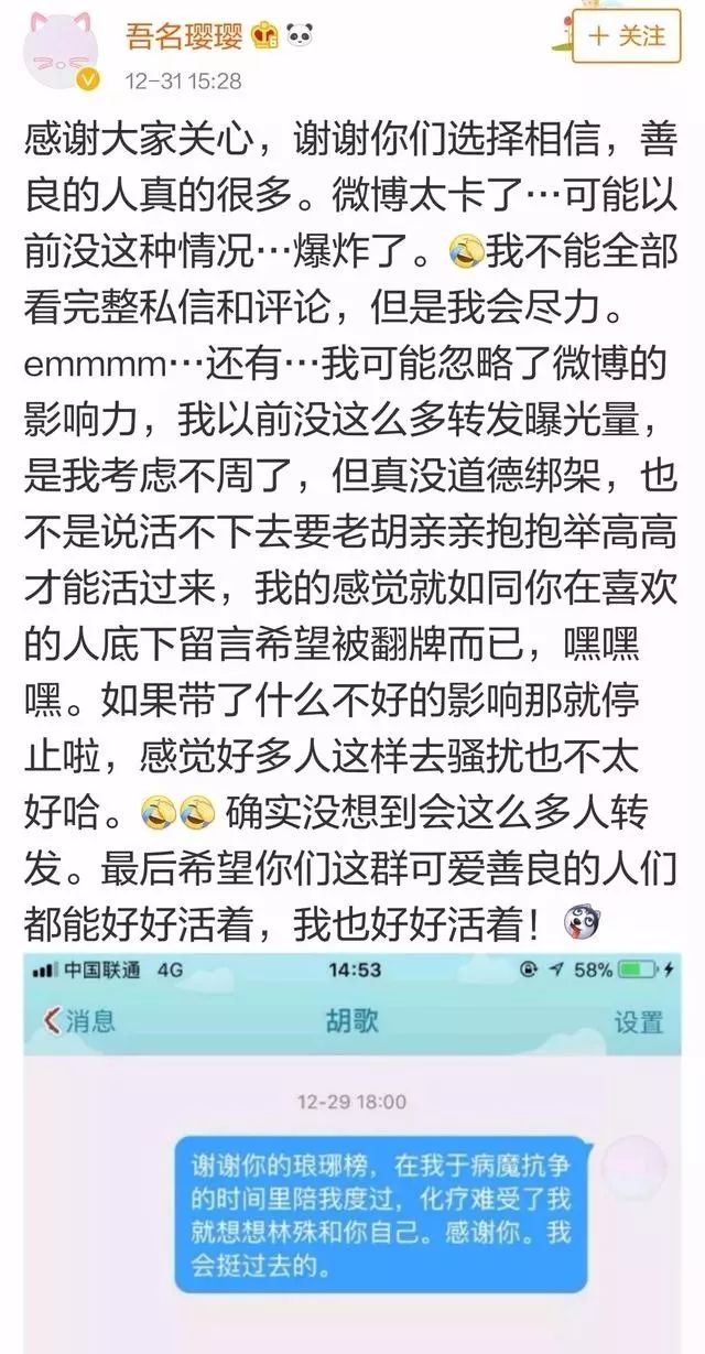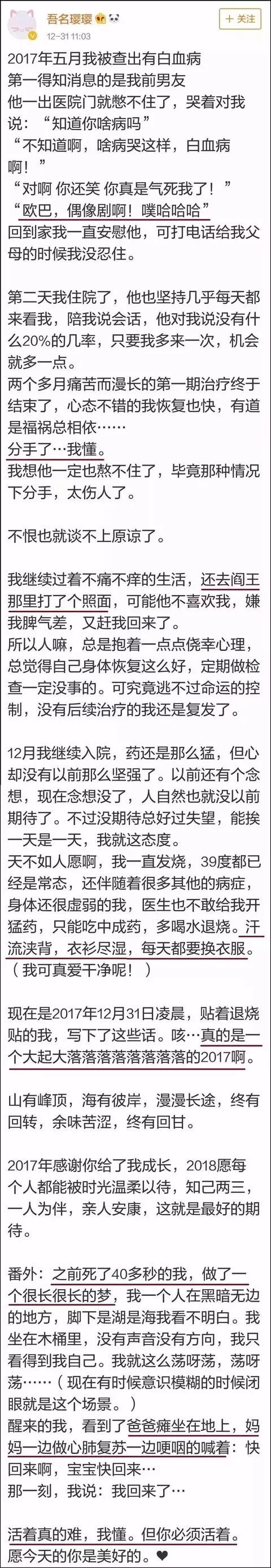 2017年12月31日,微博一个名为“吾名璎璎”的女孩子发了一篇长文感言,娓娓诉说着自己半年多以来与病魔抗争的历程,字里行间中,没有一句对生活的绝望,反而多了一些调侃。不禁让10万网友更加觉得辛酸。