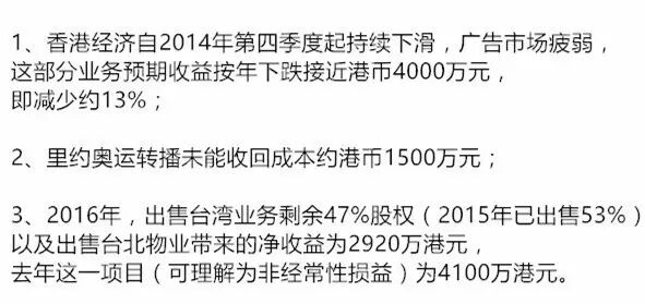 12月初,TVB发出了近三十年来的第一次盈利警告。TVB警告称,料2016年度盈利较上年下跌55%至65%,TVB详细列出了这些影响因素: