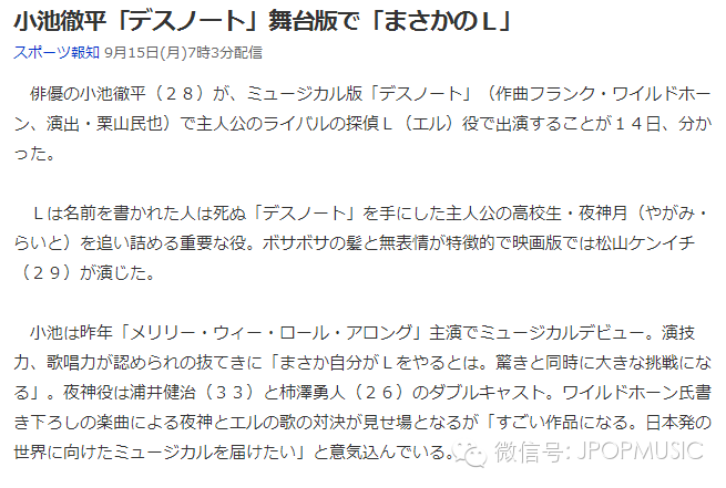 【星闻】小池徹平--将在音乐剧版「死亡笔记」中饰演L 东瀛音悦Tai 日韩男星 2014-09-15 18:03:05 412 创作不易,用心坚持,欢迎请BaGua喝几杯爱心咖啡!打赏并支持本文 打赏并删除本文 小池徹平将在音乐剧版「死亡笔记」中饰演主人公夜神月的对手侦探L。夜神月将由浦井健治和柿澤勇人两人饰演。音乐制作由著名作曲家弗兰克.怀德霍恩担任,夜神月将和L进行一场精彩的歌剧对决。音乐剧将于2015年4月在日本东宝日生剧场上演,同年7月在韩国首尔·LG艺术中心上演。 创作不易,用心坚持,欢迎请BaGua喝几杯爱心咖啡!打赏并支持本文 打赏并删除本文 感谢您的支持鼓励,我会继续努力的!文章地址:用户邮箱:打赏金额:USDT 请输入数字点击”去打赏“,即可进行打赏支持本文章哦 About the Author 东瀛音悦Tai 功能介绍:音悦Tai日本音乐频道 官方认证:北京宽客网络技术有限公司 Related Posts 坂口宪二无期限休止艺能活动,《医龙》第五季怕是盼不来了吧. 2018-04-02 17:06:16 【MUSIC STATION ウルトラFES 2017】演唱曲目公开! 2017-09-15 17:46:19 【长瀬智也*神谷浩史】天呐,次元壁又裂了! 2017-07-04 17:55:44 【稻垣吾郎、草剪刚、香取慎吾】合约期过后退出杰尼斯事务所! 2017-06-19 17:25:06 【相叶雅纪】侦探大人,可否一起喝杯红茶~ 2017-03-17 17:55:13 发表评论
