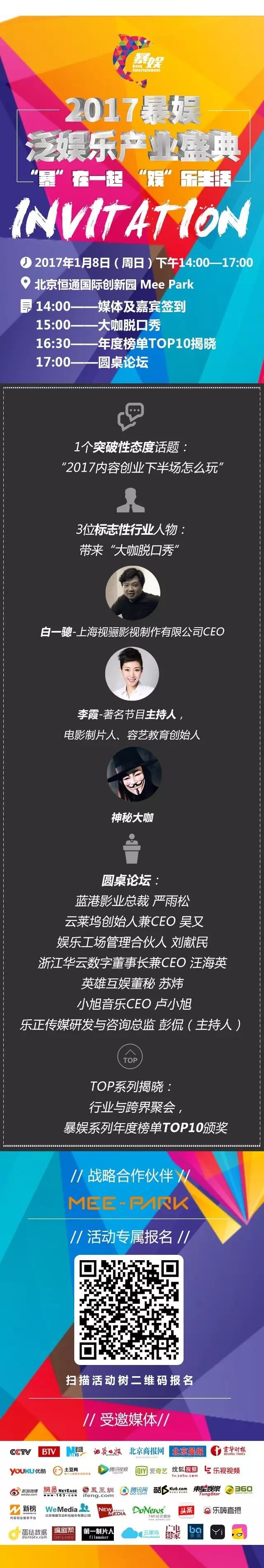 分享、交流、对话、碰撞。每一次行业的进步,都离不开年度标志性人物与媒体的推动。暴娱全媒体矩阵作为泛娱乐产业第一媒体矩阵,更将在现场广邀媒体,组成新媒体观察团对话大咖嘉宾,增强舆论场和影响力。同时邀请CCTV、东南卫视、证券日报、北京商报、北京晨报、新京报、腾讯、新浪、网易、搜狐、凤凰,央视网、新华网、腾讯视频、爱奇艺、搜狐视频、乐视视频等主流媒体组成强大的媒体报道网,共同聚焦2017行业新方向和下半场。