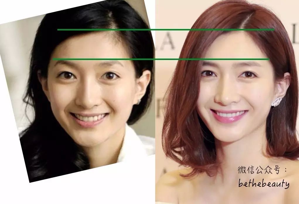 ▲左图是江疏影原图,右图是增长了额头,下调了山根位置,缩短了下巴之后的三庭调节版江疏影,是不是年轻、柔和了一些?