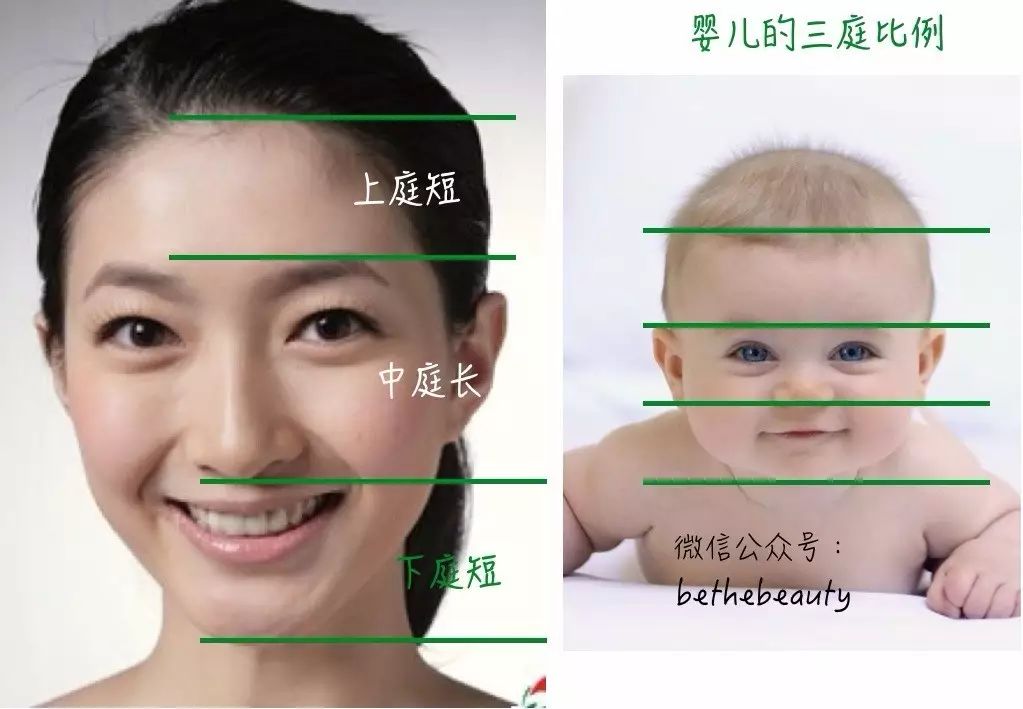 ▲对于成年人来说,发际线最高点到眉毛最高点(是的简妮认为不是眉心而是眉毛最高点)的距离应该恰好是脸长度的1/3,而对于婴儿来说,他们的额头会占据更多的脸长度,甚至达到1/2