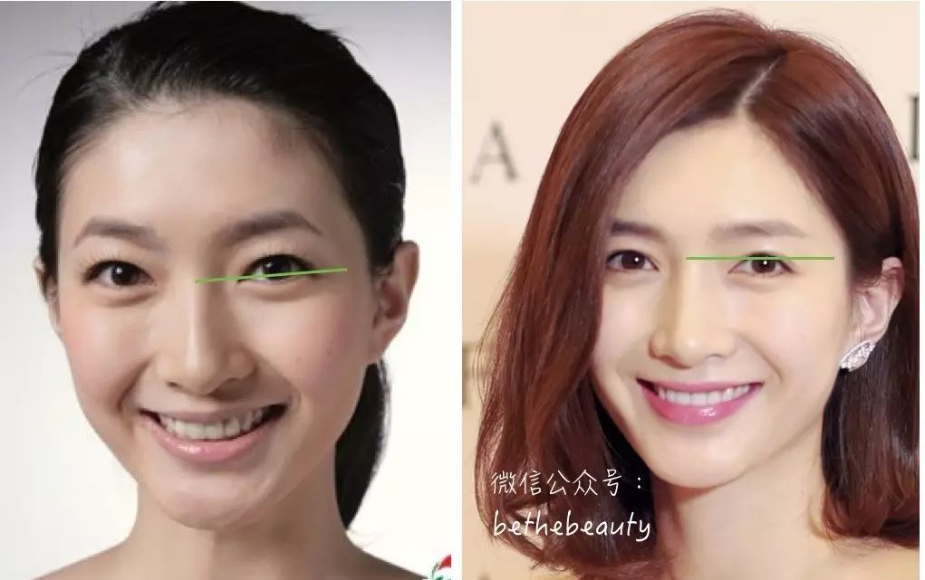 ▲鼻子开始变高的地方我们一般说是「山根」,以绿线标出山根和眼睛的相对位置,可以发现江疏影的山根位置不知不觉中越来越向上移动。