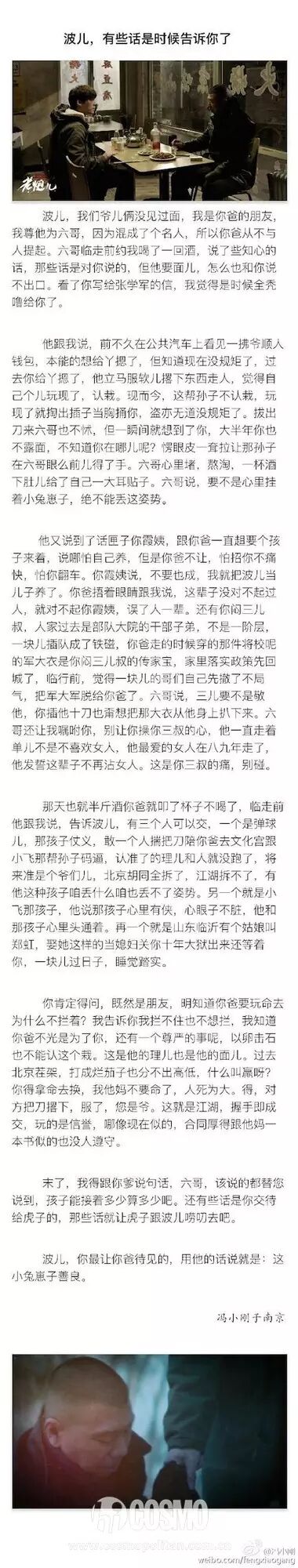虽然很长,但是我一口气看完真的是满满感动,正如峰峰在信里所说,通过拍摄自己逐渐了理解“老炮儿”的含义,是一代人,是一种精神,甚至是一种信仰。一部电影既能够和冯小刚这样的资深电影人合作,一方面又能够收获一份父亲般的感情,这本身就是一段传奇。