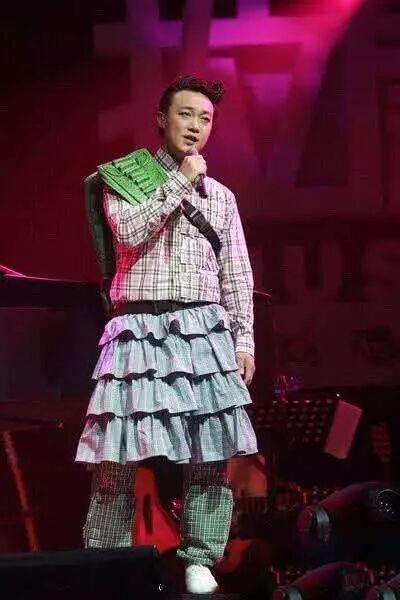 Eason这一身感觉不但土,还有种说不出来的怪异感上身是衬衣下身是裙子,裙子下面又是跟衬衣一个料子的裤子,然后脚上居然是穿着小白鞋,这些也就算了,但是肩上那个绿色的像子弹袋一样的包是怎么回事?