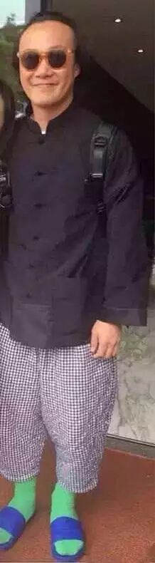 这是前段时间的热搜,被网友们比喻成为是从头到脚的灾难,先是Eason高到天际的发际线,带着老年人的墨镜,黑色中山装,浅灰色的肥佬裤,最显眼的就是草绿色的袜子,居然还穿了一双蓝色的拖鞋,Eason造型师是谁?真的该打!