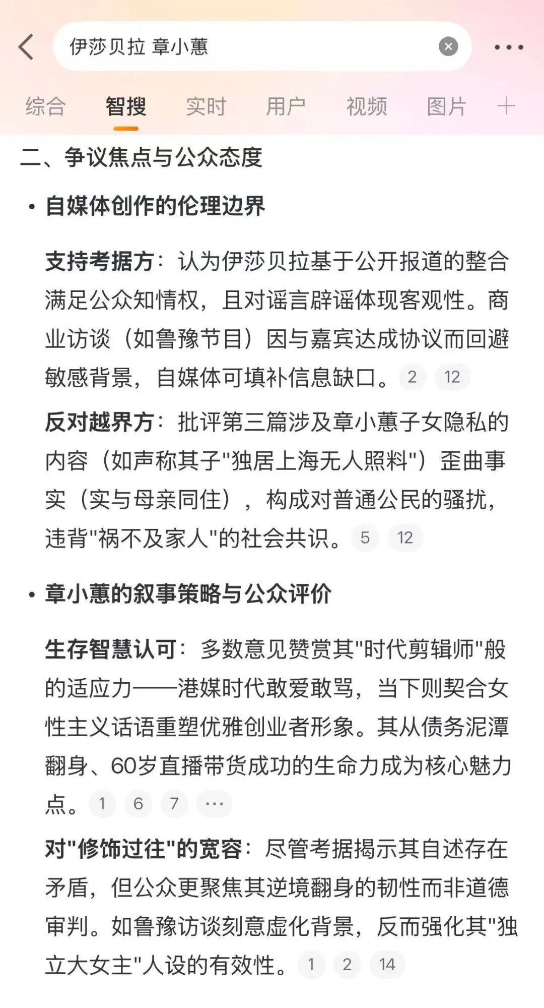 这件事在微博上讨论得热火朝天,大家各自站队。智搜总结得还蛮全面,把正反方罗列得清清楚楚。AI时代,各种信息真是掰烂嚼碎了喂给大家。
