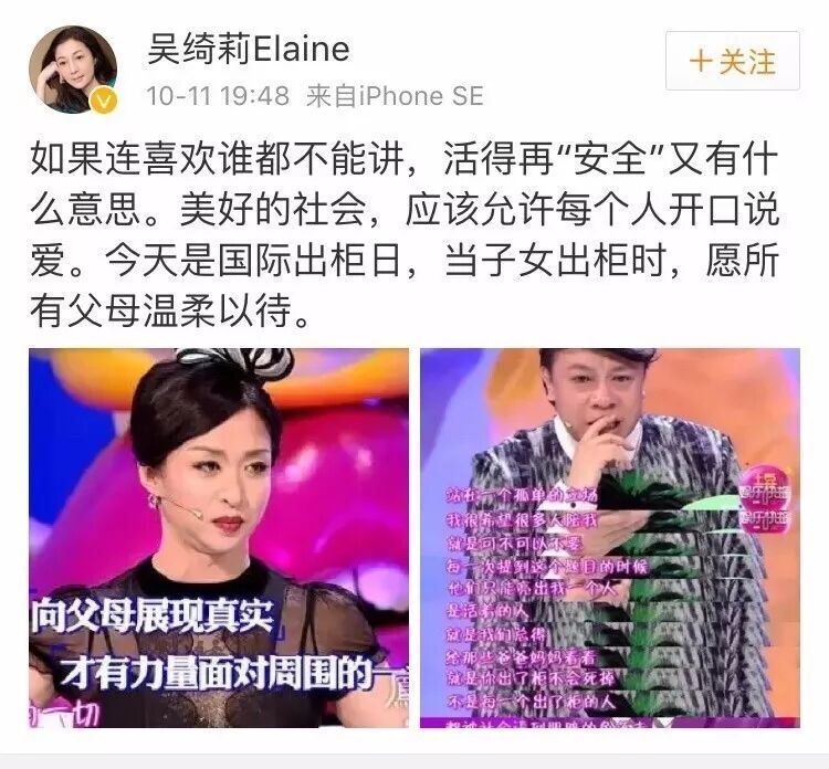 “美好的社会,应该允许每个人说爱,今天是国际出柜日,当子女出柜时,愿所有父母温柔以待。”
