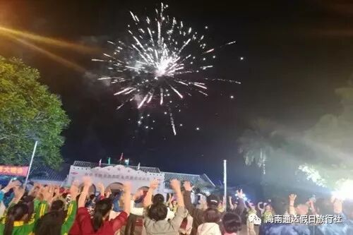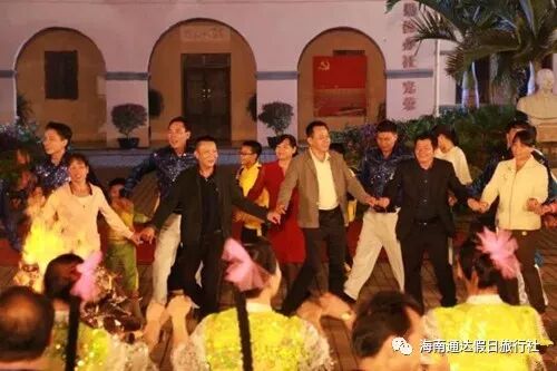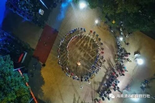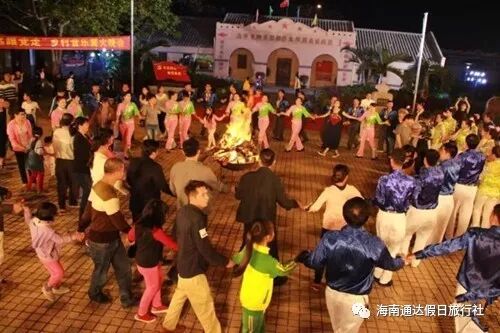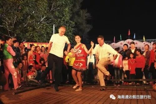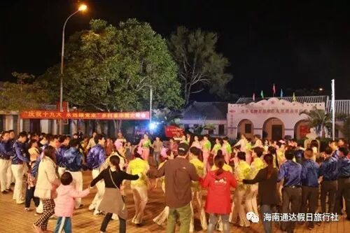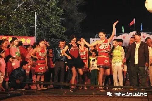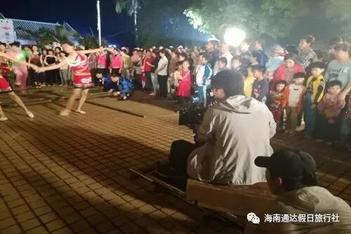 当广场灯光打亮,伴随着海南黎族竹竿舞乐曲响起,身穿着民族服装的青年男女跳起欢乐的竹竿舞。舞时,两边各蹲2个人,每个人双手平握竹竿末端,按节奏张合敲打,舞者随着竹竿的张合,两脚不断上跳下踏,做出各种美妙动作舞蹈颇为热烈,引人入胜,现场的很多观众受到感染,不由自主的跟着舞者学跳起来,“哈哈”作乐。