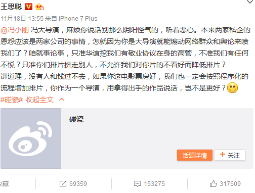 看一下发布日期,是电影上映不到半天时间内发布的,是不是可以恶意揣测一下,此次发文是冯导团队计划已久?积怨已久?坐等爆发?