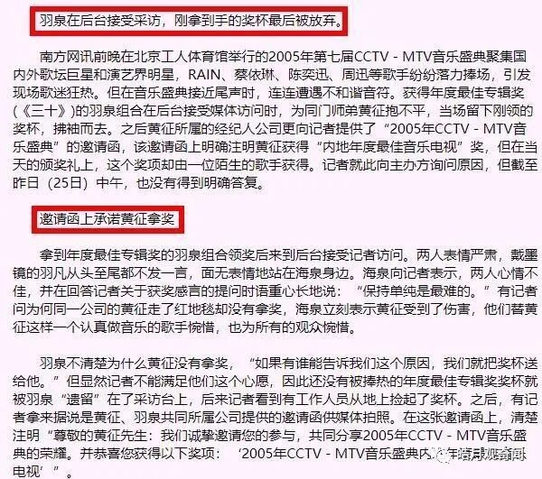 2005年第七届CCTV音乐盛典的时候,邀请函上承诺黄征拿奖,结果羽泉在后台接受采访,刚拿到手的奖杯最后就扔了回去,记者看到有工作人员从地上捡起了奖杯,就因为这件事情,两兄弟也发生了一些误会。