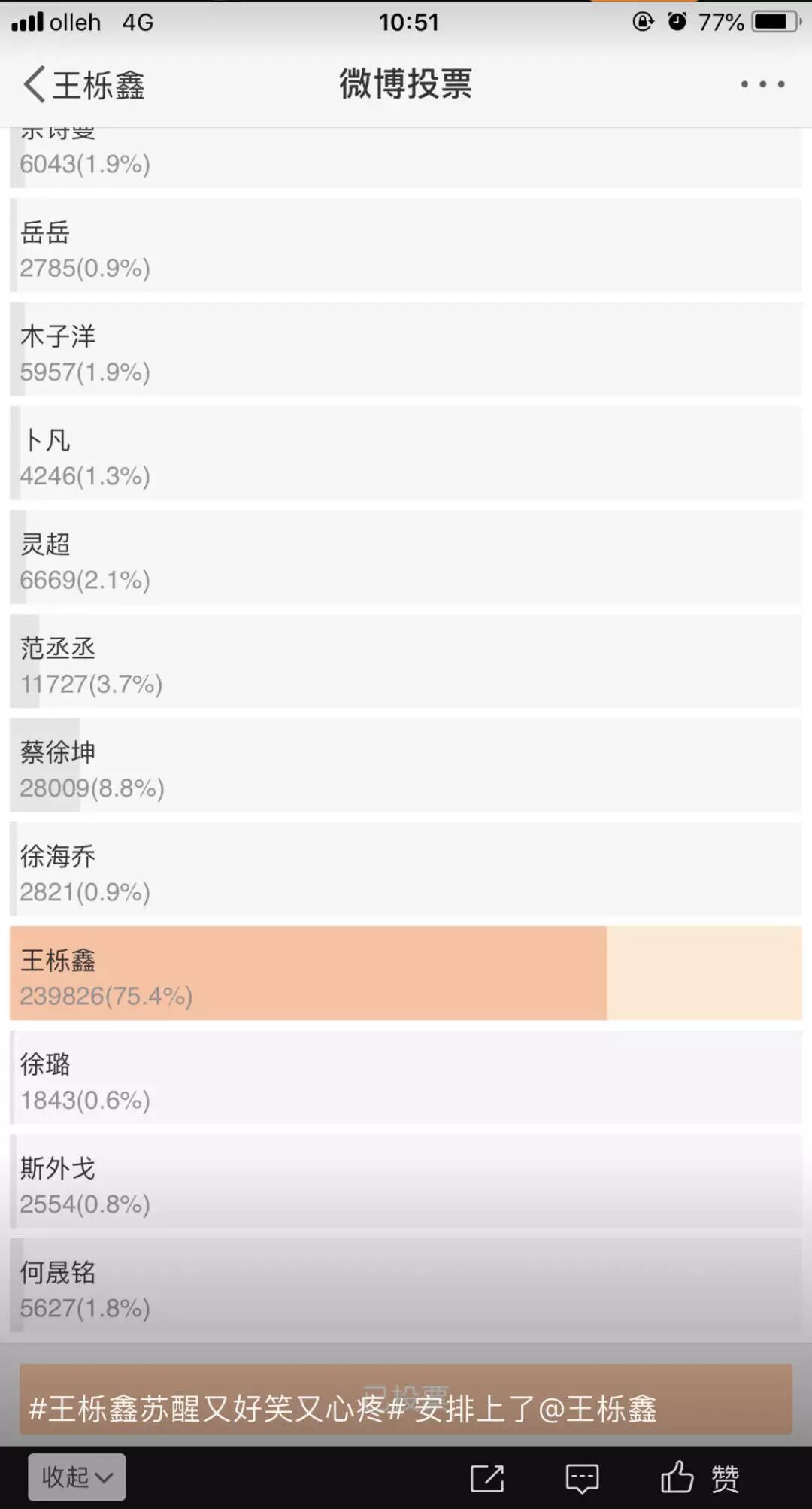 在各位吃瓜群众和粉丝的努力下,王栎鑫已成为得票最多的人了。