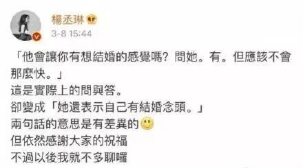 以后不会再多聊感情问题,成熟后的杨丞琳更加珍惜感情,不再像年轻时那样任性放纵,更选择小心翼翼地保护。