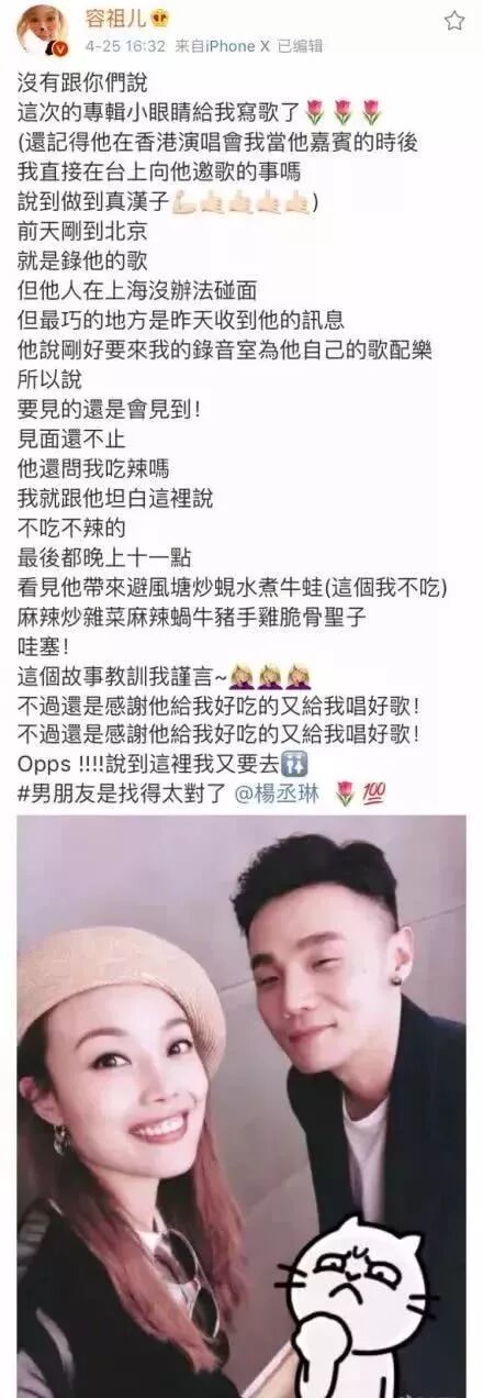 但此时的杨丞琳不再是小女孩时期的杨丞琳,对于舆论有了更强的承受力,对于感情也有了自己的方向。和李荣浩两人每次暗戳戳撒狗粮,却又让吃瓜的大家猝不及防。在对方过生日时只是隐晦地发一句生日快乐,不艾特不提名,相当低调。