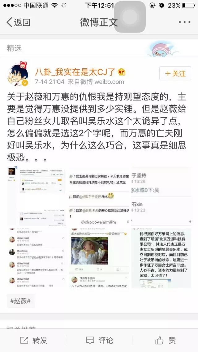 但是7月14日被网友挖出赵薇在13年给某粉丝孩子取的名字“乐水”刚好跟万惠口中被赵薇害死的她老公重名,好巧不巧,连名带姓都一样,吴乐水。
