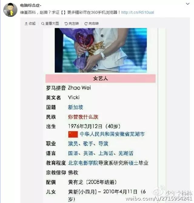 第一张是网友所谓的全世界最权威的维基百科上面写的关于赵薇的资料,民族一栏居然写了个“你管我什么民族”……这么明显的p图看不出来?