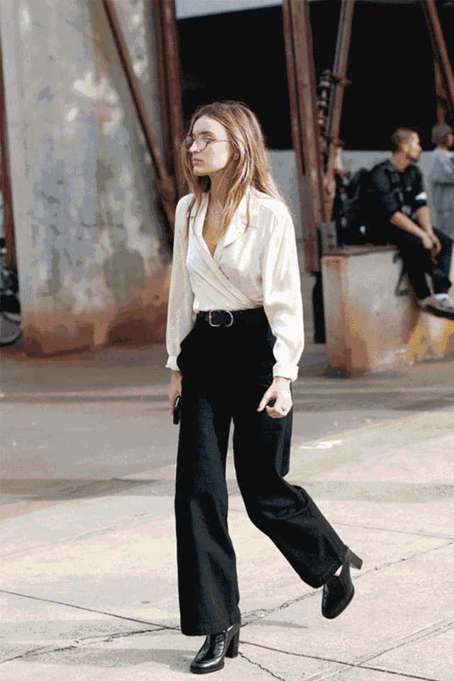 长款白色阔腿裤上身就很吸睛,搭配黑色衬衣经久耐看。