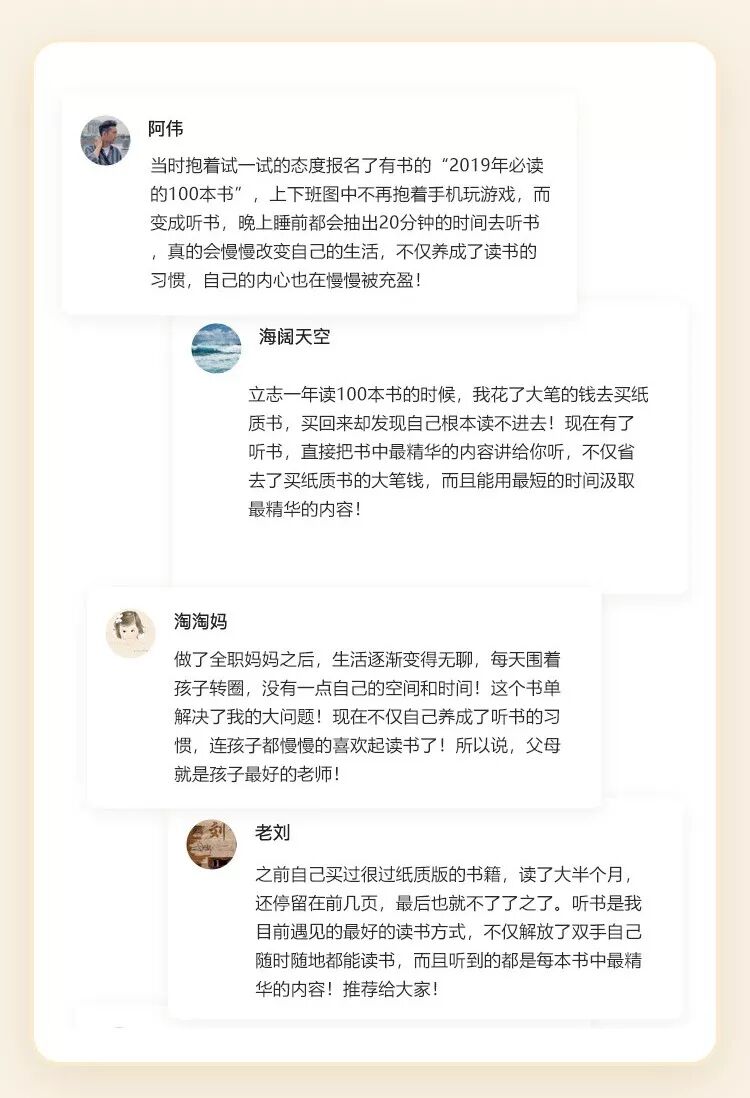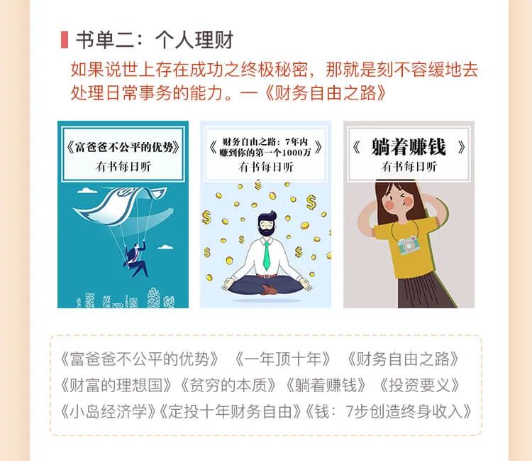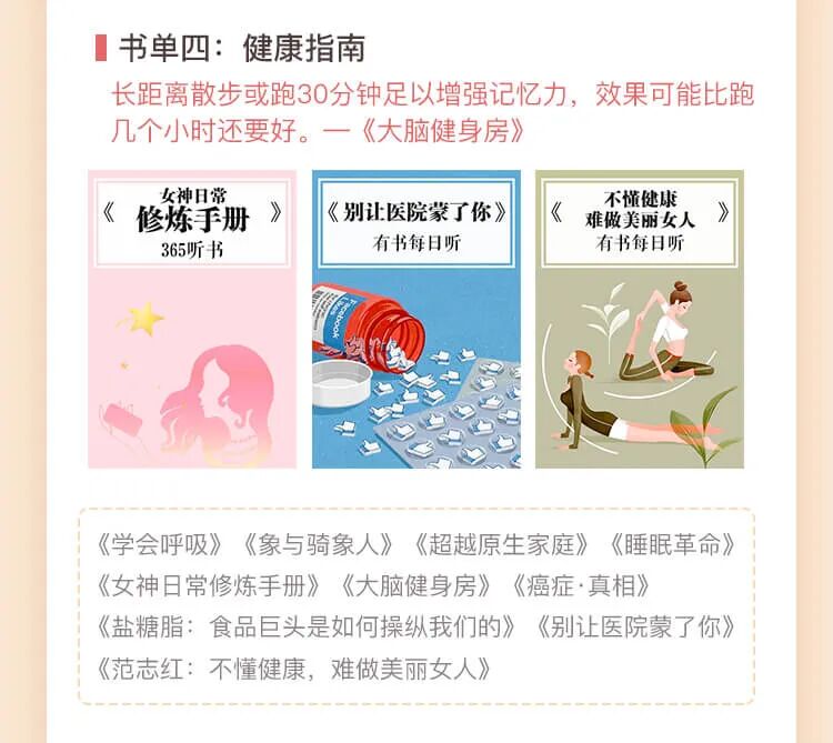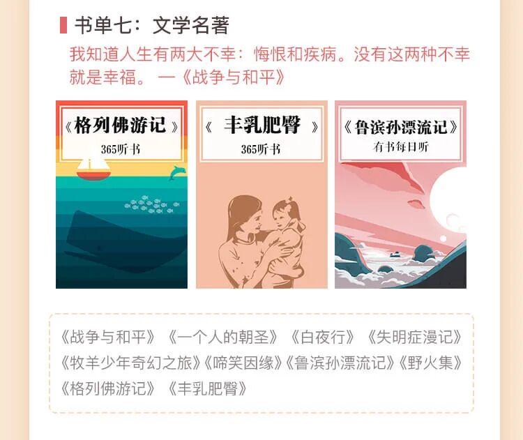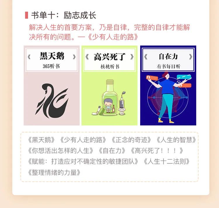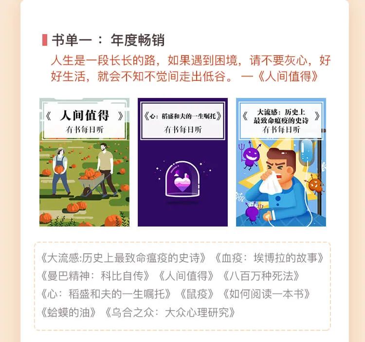 上下班地铁上、候车时、临睡敷面膜、做家务、吃饭……任何不被注意的碎片化时间,你都可以用来听书,在不知不觉中,轻松听完这100本优质好书。