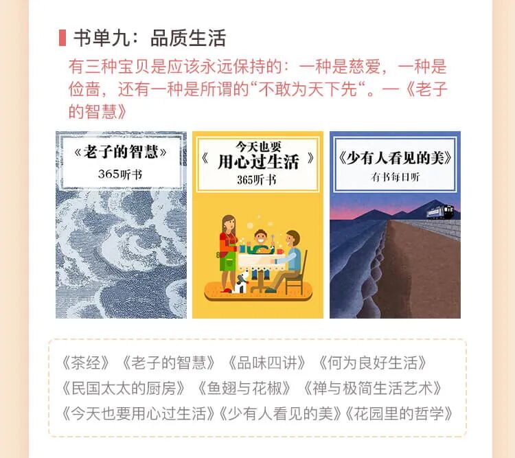 书单9:有三种宝贝是应该永远保持的:一种是慈爱,一种是俭啬,还有一种是所谓的“不敢为天下先“。