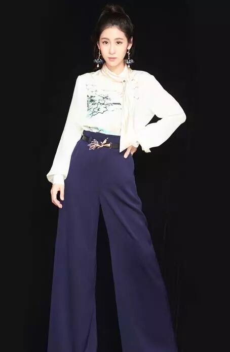 张碧晨一身白色上衣,非常简约,印花设计,提升了整体的活跃度。搭配藏蓝色阔腿裤,显瘦的同时彰显出强大气场!