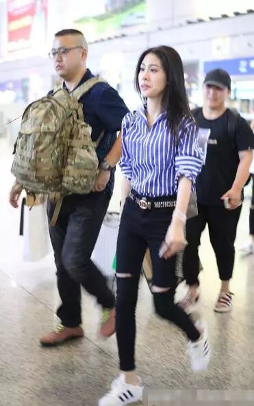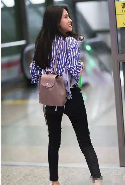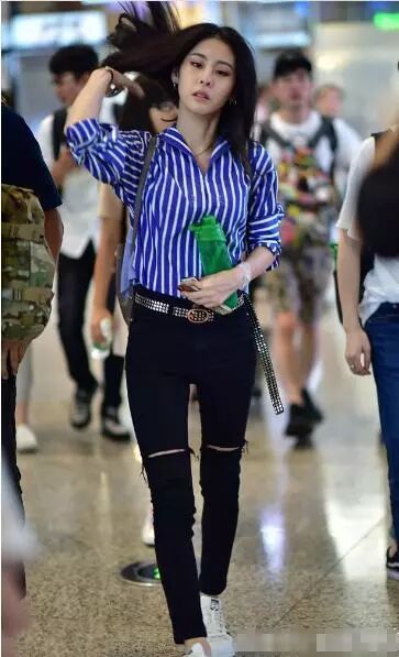 张碧晨一身经典条纹衬衫,简约又气质。深V视觉上拉长脸型,半掖衣边的穿法,有效的提高了腰线,非常显高哦!