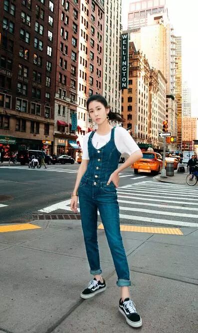 经典白色T恤,搭配背带牛仔裤,九分的长度,视觉上拉长腿部比例,搭配一双百搭帆布鞋,整体休闲又时尚。
