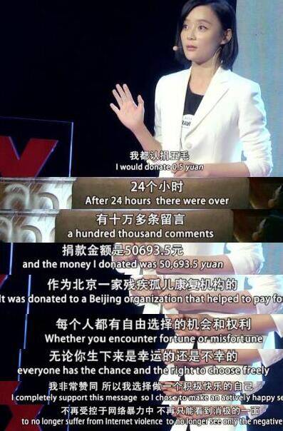与此同时,她赢得了大家的好感并抓紧时机在TED X ningbo的演讲台演讲“在网络暴力中捍卫自己”。