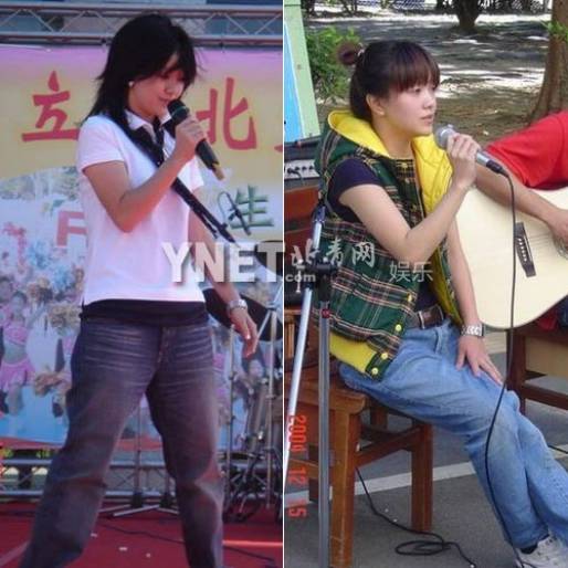 歌手出道的郭采洁腿和手都有点粗,胖的时候坐在板凳上,宝宝差点以为是板凳长高了,幸好后来瘦下来了,你看左边那个胖的好像高晓松。