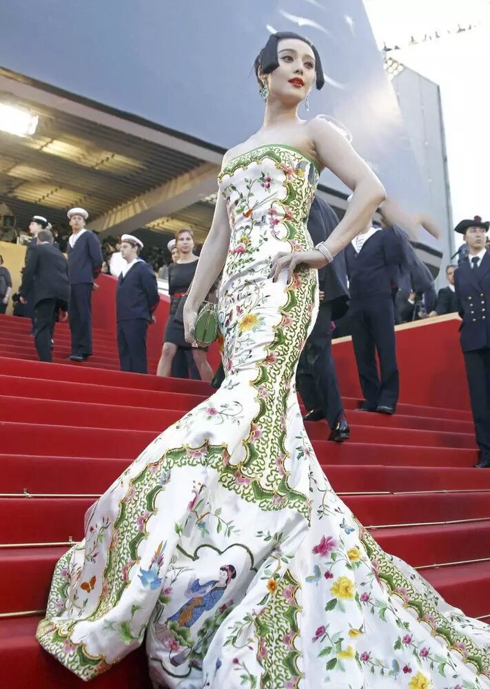 回顾一下范爷最经典的战袍:来自她御用设计师卜柯文的“中国瓷”——裙子四面秀的是四大美人,想有破绽都难啊。