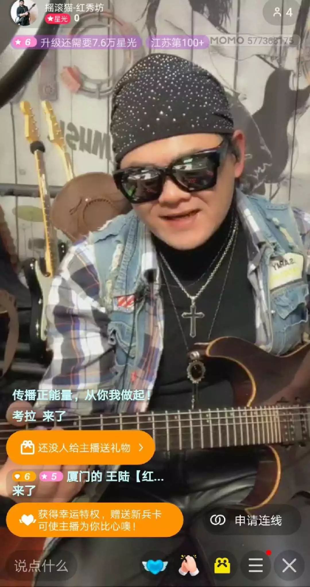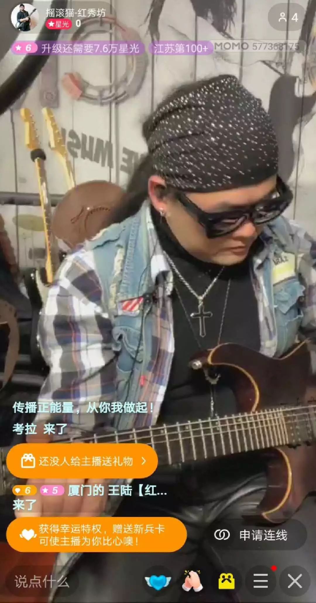 摇滚猫,一个帅气的大叔,同时也是一个有趣的灵魂,很会卖萌的大叔呢!看穿着打扮他是不是有一种迪克牛仔的感觉,这位大叔不只是穿着打扮像迪克牛仔,他的音乐与迪克牛仔也有几分相像,每当深夜,他都会在直播间练歌,你愿意做陪他的那个忠实听众吗?