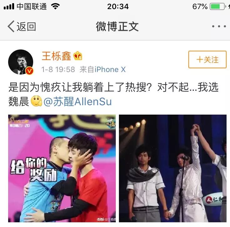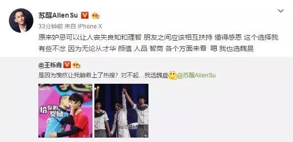 而在41分钟后,王栎鑫又再次发博表示“是因为愧疚让我躺着上了热搜?对不起……我选魏晨”,更是艾特了苏醒本尊。