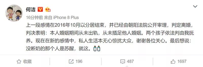 最后,何洁还用10字称:“没断奶的那个人是苏醒”,奶凶了一下好友。