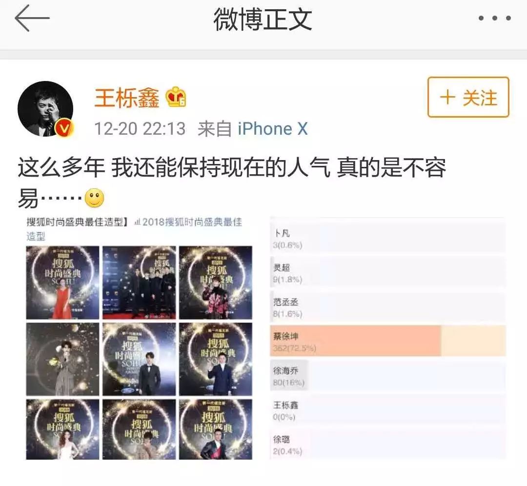 之前,王栎鑫发了一条微博,调侃自己的人气十分“稳定”。