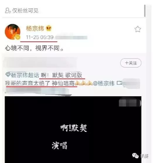 粉丝狂吹彩虹屁说我哥的声音太绝了,他唱的版本才是最好听的,杨宗纬也阴阳怪气的加了个转发文案说“心境不同,视界不同”。