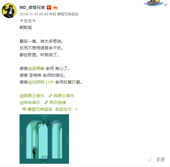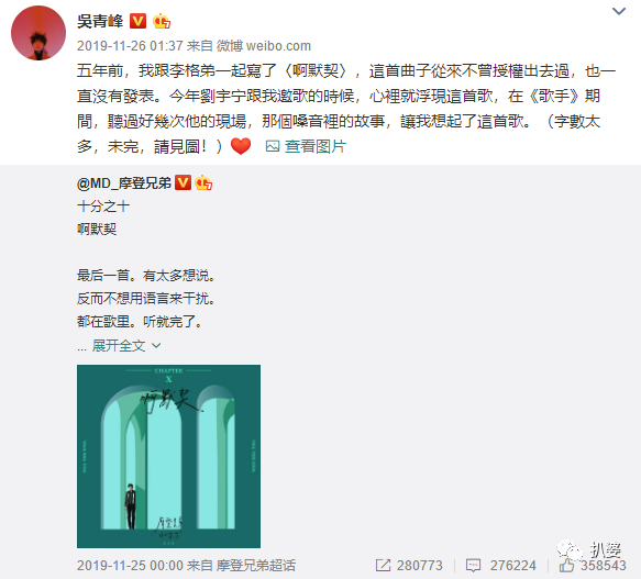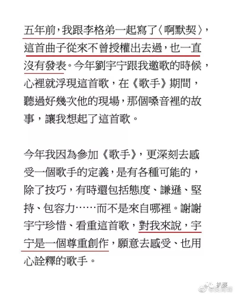 去年11月25号刘宇宁发歌时还艾特感谢了原创者吴青峰。