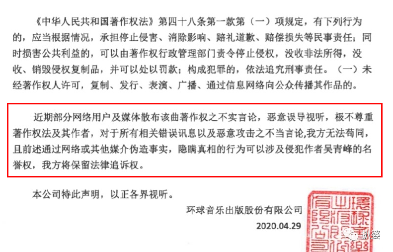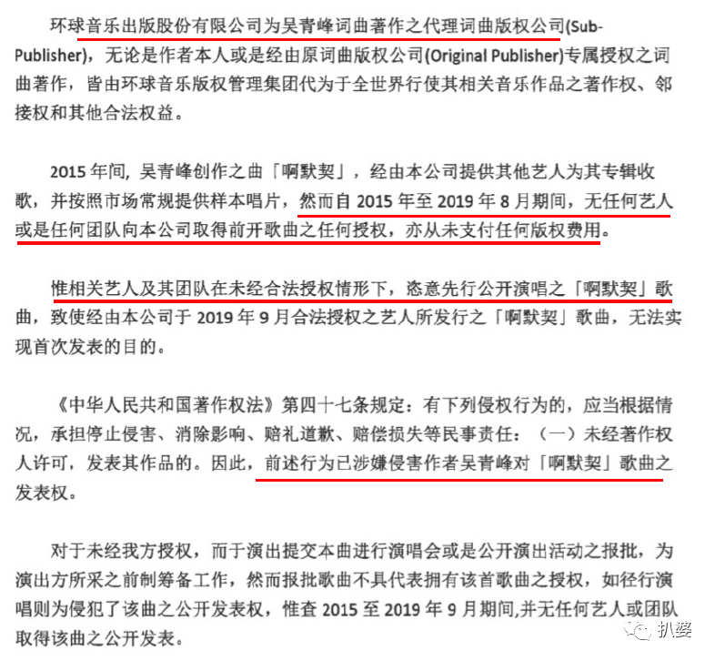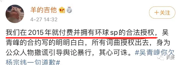 也就是说,在他们看来,第一,青峰不拥有他自己创作的歌的版权,第二,杨宗纬有花钱从环球买走这首歌的版权。