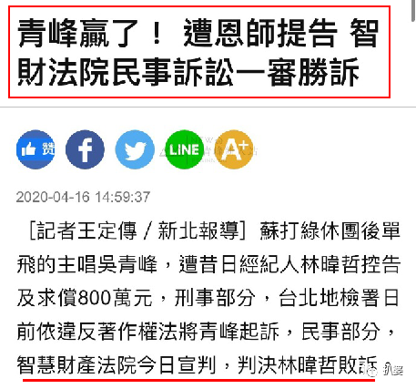 先是吴青峰迎来了和林暐哲官司的一审民事胜诉(刑事部分还没宣判)。