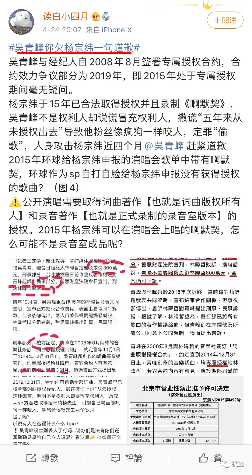最有意思的是,因为吴青峰和前经纪人林暐哲正在打版权官司,杨宗纬粉丝顺势用林暐哲来给自己的论文当锤。