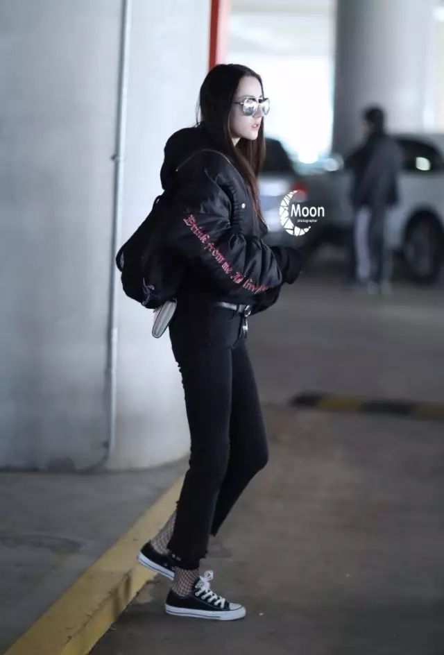 马思纯黑色飞行员夹克搭配墨绿色卫衣,下身则是简约的牛仔裤和运动鞋,随性舒适又耐看。▼