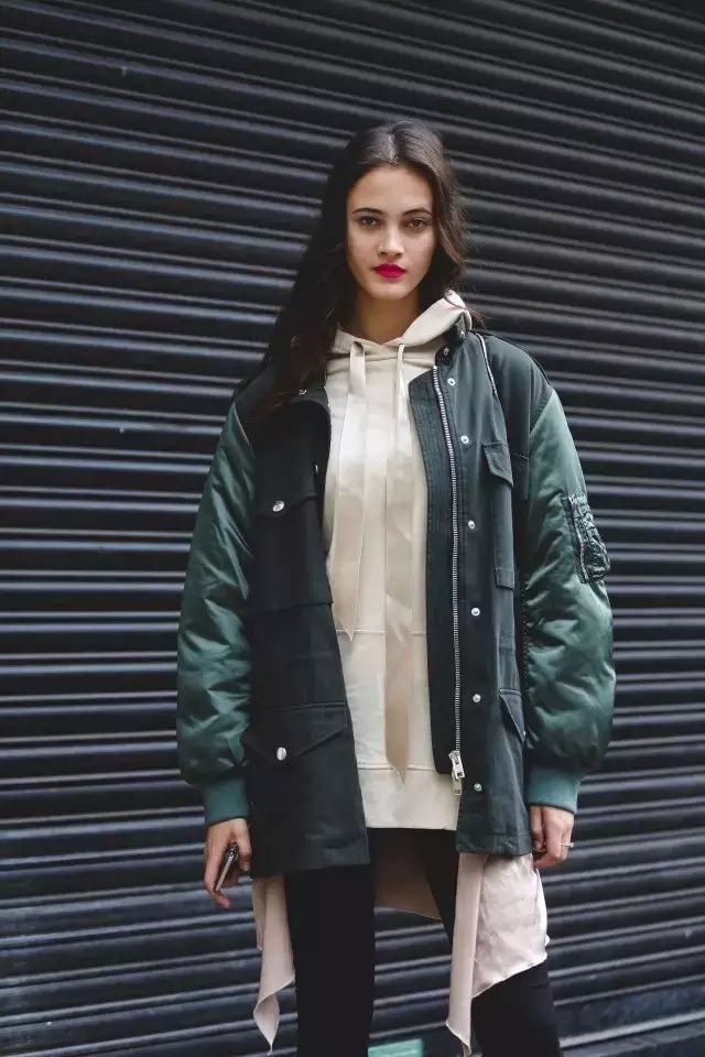 近年大热的oversized飞行员夹克搭配一件同样个性十足的卫衣,谁还敢说你不时髦?▼
